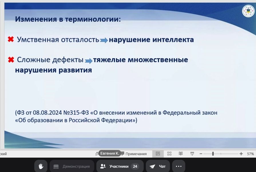 Марина Александровна Крюкова, старший методист МБУ ДО г. Мурманска «ЦПВ «Юная Гвардия», осветила тему нормативно-правового обеспечения и создания условий для успешной интеграции детей с ОВЗ.