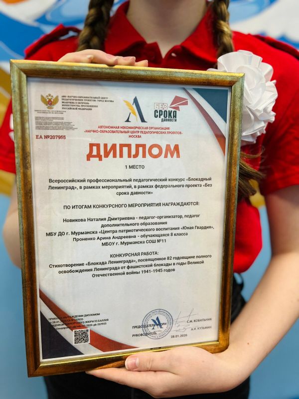Поздравляем педагога-организатора Новикову Наталию Дмитриевну и обучающуюся МБОУ г. Мурманска СОШ №11 Проненко Арину с победой во Всероссийском конкурсе!